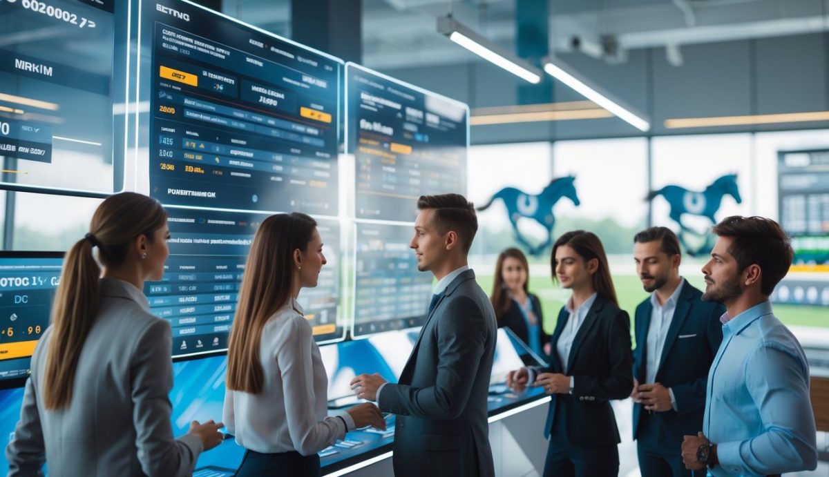 Orang-orang muda menggunakan platform taruhan pacuan kuda online dengan layar digital yang menampilkan informasi balapan dan peluang taruhan.