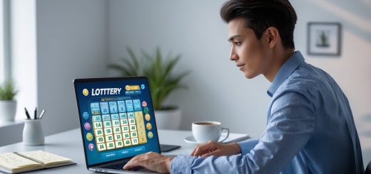 Sebuah laptop di meja kerja menampilkan situs lotere online dengan suasana profesional dan elemen yang melambangkan kepercayaan.
